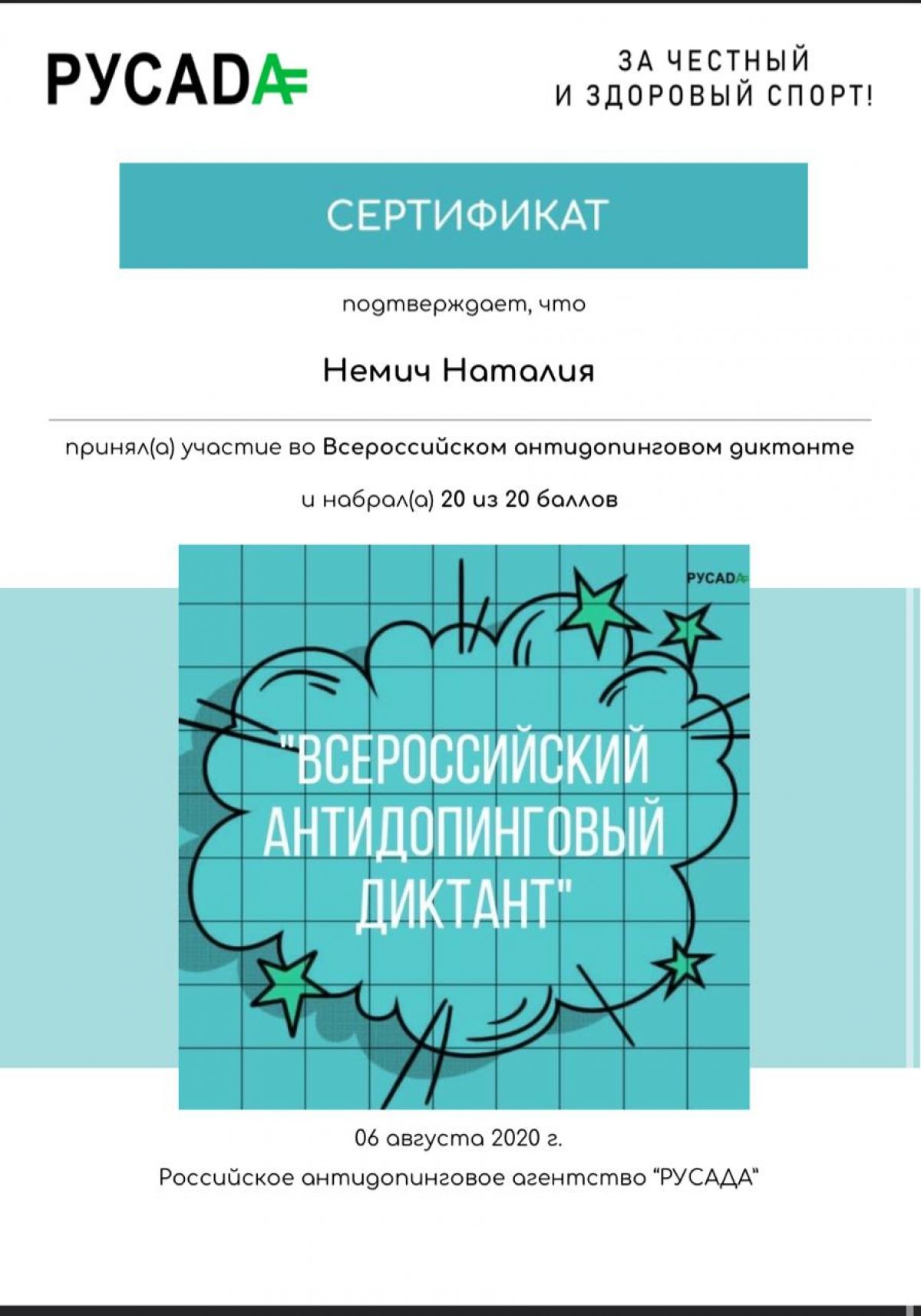Всероссийский антидопинговый диктант - это акция РАА РУСАДА, приуроченная к Дню физкультурника. Пройдя тест, спортсмены и тренеры получили памятный сертификат об участии во Всероссийском антидопинговом диктанте.