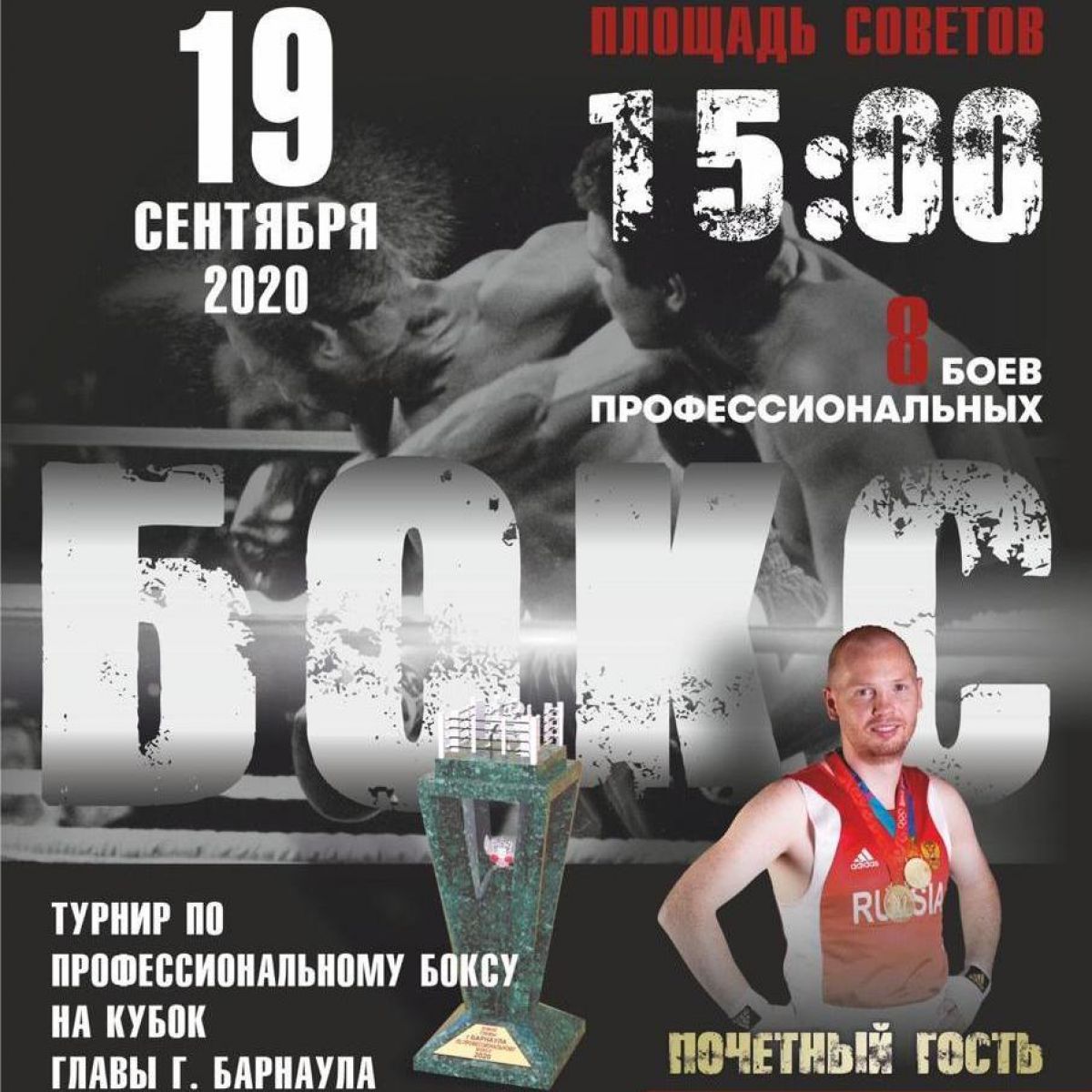 19 сентября в Барнауле в рамках празднования Дня города на площади Советов пройдет турнир по профессиональному боксу на Кубок главы Барнаула.