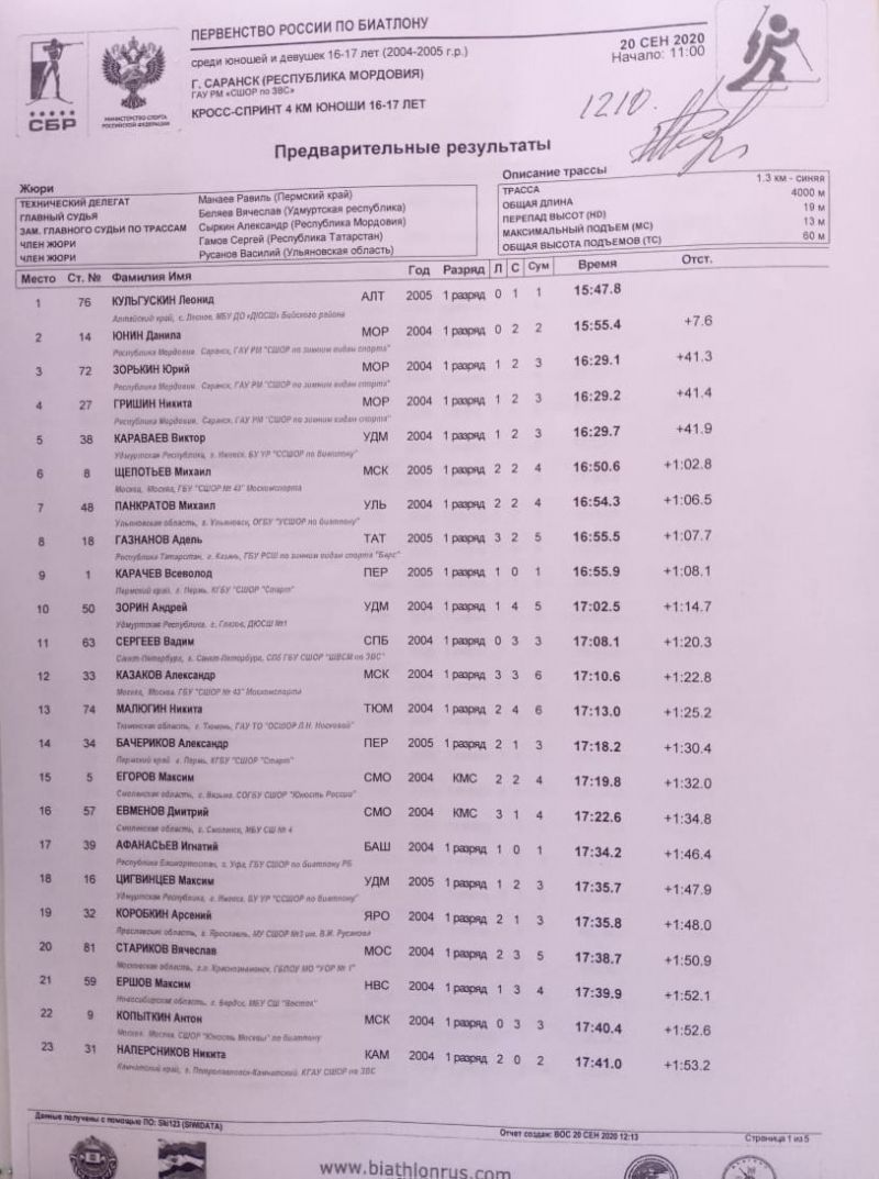 И в первый же день представитель нашего региона поднялся на верхнюю ступень пьедестала. Воспитанник ДЮСШ Бийского района, спортсмен краевого Центра спортивной подготовки сборных команд Леонид Кульгускин (тренеры И.Л. Кульгускин и Л.А. Кокорина) одержал победу в дисциплине «кросс-спринт 4 км» с результатом 15:47.8 (1 штрафной круг). Леонид опередил двух представителей Мордовии - Дмитрия Юнина (+7.6, 2 штрафа) и Юрия Зорькина (+41.3, 3 штрафа). Еще один представитель Алтайского края Павел Волков неудачно стрелял и в итоге оказался в седьмом десятке с пятью штрафами и отставанием +3:26.4. В гонке приняло участие 98 спортсменов.