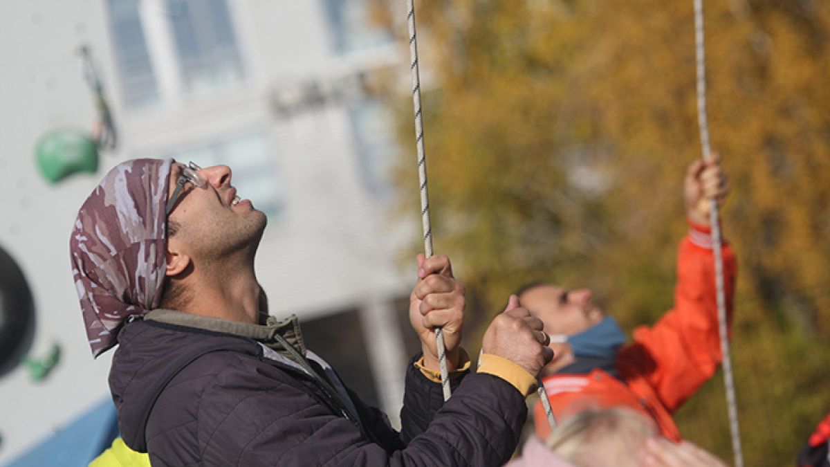 В первый день скалолазы состязались в категории «Трудность», где нужно было как можно выше подняться по отвесной стене. Перед стартом некоторые участники проводили странный ритуал - хлестали друг друга по ладоням. Как выяснилось, пальцы должны быть горячими, чтобы лучше хвататься за зацепки. Во время прохождения трассы нужно еще и вщелкивать страховочную веревку в расположенные по трассе оттяжки. Другой конец страховки держит специальный судья, который стоит внизу. Конечно, не всем спортсменам удавалось пройти трассу до конца. Многие во время восхождения допускали срыв, после чего повисали на веревке.