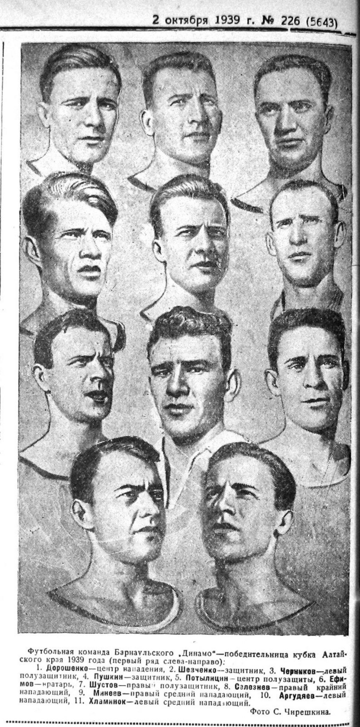 «Быстро и уверенно повели атаку футболисты новосибирского „Динамо“. Зрители с интересом следили за игрой, но напряжения, которое обычно с первых же минут матча приковывает внимание и заставляет остро переживать борьбу равных противников, на этот раз не ощущалось. Хозяева поля нападали, гости защищались. Это было ясно даже для непосвященных в тонкости игры. Уже на 11-й минуте игры нападающий новосибирской команды Владимир Селезнев, получив прекрасно поданный полузащитником Петрухиным мяч, забивает его в ворота барнаульцев. Как обычно, первый забитый мяч послужил сигналом к тому, что обе команды стали играть активнее: барнаульцы пытались сквитать счет, новосибирцы стремились закрепить успех. Преимущество новосибирцев вскоре стало очевидным. Вяло играющие защитники барнаульского „Динамо“ Пушкин и Шевченко дают возможность нападающим новосибирской команды свободно разыгрывать свои комбинации. Особенно хорошо в этом матче играл правый крайний Орлов, явившийся инициатором большинства тактических комбинаций и сам забивший в ворота барнаульцев два мяча. Точность в ударах по воротам показал новосибирец Владимир Селезнев, забивший 4 мяча. Хорошо также играли нападающие Блинков (в дальнейшем - один из лучших полузащитников советского футбола в послевоенный период в составе московского „Динамо“. Прим. В.Л.) и Семенов, в защите выделялся Свекров, в полузащите - Валеулин и Петрухин. В игре барнаульской команды не было достаточной быстроты и точности. Полузащита отрывалась от своего нападения, пасовка велась без всякой системы. Матч выиграли динамовцы Новосибирска со счетом 6:1».