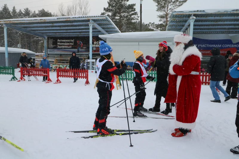 Награды и подарки участникам соревнований вручал Дед Мороз, который к восторгу детей выехал на их клич из леса на лыжах.