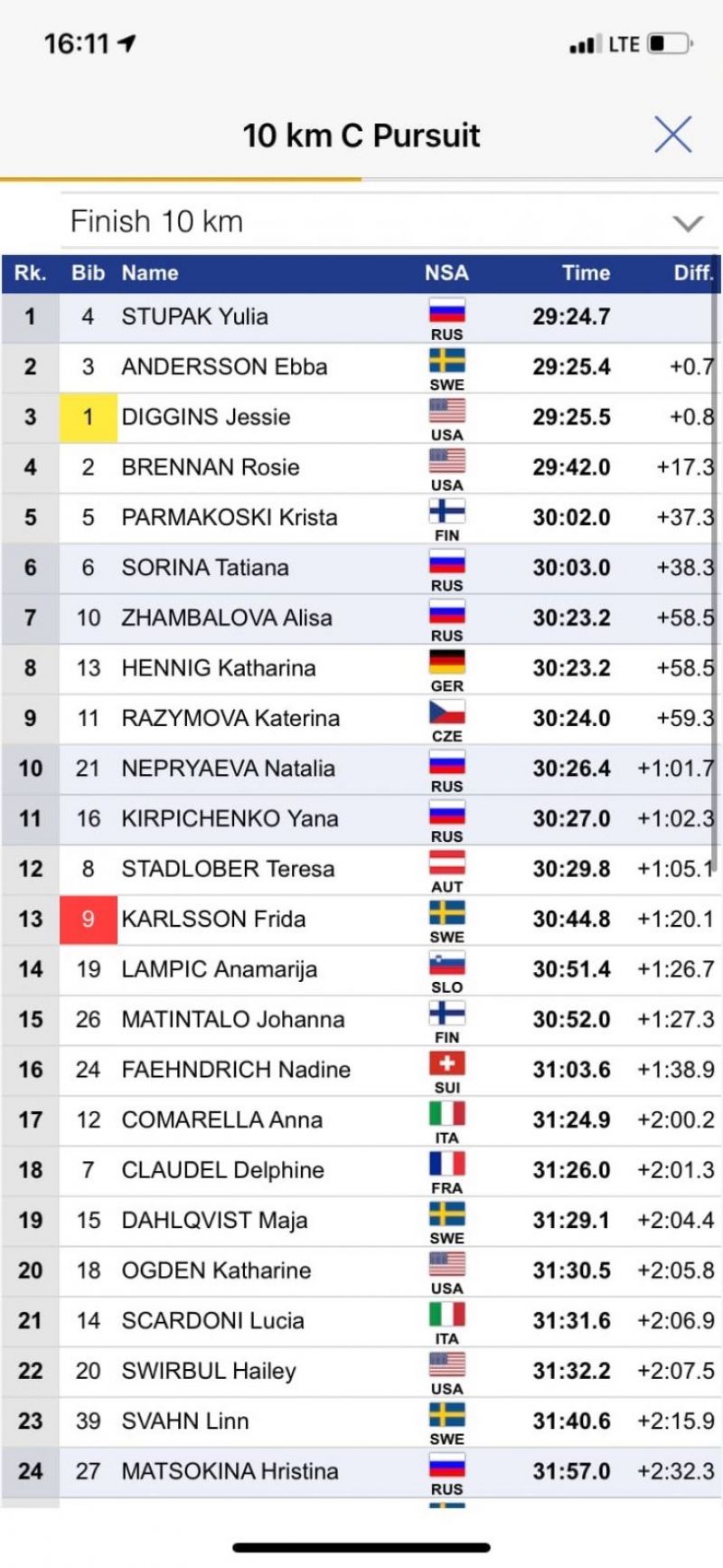 Наша землячка Яна Кирпиченко ушла на дистанцию 10 км шестнадцатой. Был момент, Яна во второй половине гонки боролась даже за седьмое место - в одной группе с Алисой Жамбаловой и Натальей Непряевой. Но в итоге оно досталось Алисе Жамбаловой, которую комментаторы «Матч ТВ» всячески расхваливали за её прогресс, - и вполне заслуженно. Она улучшила своё положение по результатам гонки преследования на три позиции. Ещё больший прогресс был у Натальи Непряевой, переместившейся с 21 места на десятое. В их тени как-то оказалась Яна Кирпиченко. Между тем, она переместилась с 16-го на 11 место! А когда был опубликован протокол с раскладом времени исключительно по сегодняшней гонке (без учёта гандикапа), то выяснилось, что у Яны вообще четвёртое время! Вслед за победительницей Юлией Ступак, Натальей Непряевой и Эббой Андерсен. У Алисы Жабаловой она отыграла в гонке преследования 16 секунд!