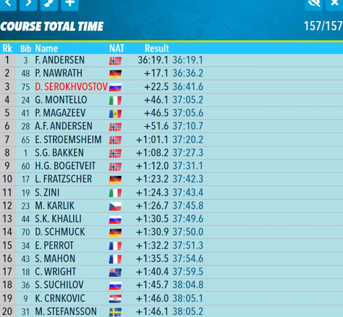 24. Никита Поршнев (Россия) (0+0+1+1) — +2:36.3