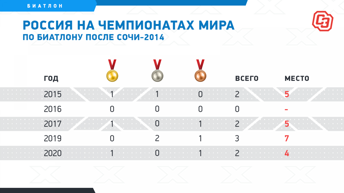 Из-за санкций ВАДА сборная России выступит в Словении в нейтральном статусе — нашим биатлонистам и тренерам рекомендовано не публиковать в социальных сетях изображение госсимволов страны, а в случае побед россиян будет играть гимн Международной федерации (IBU). Но этих самых побед надо сначала дождаться. Ведь пять лет назад мы уехали с чемпионата мира вообще без единой награды. Сейчас считается, что главные надежды России на медали в Поклюке — это лидер мужской сборной Александр Логинов в личных гонках и эстафетные команды.