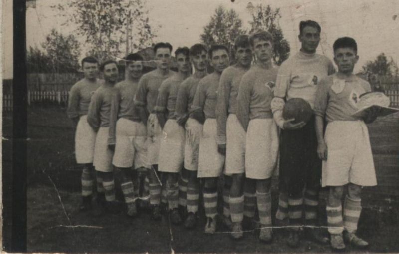 Выиграв матчи у ряда футбольных команд края, наши футболисты встретились в финале с одной из сильнейших футбольных команд СибВО, выигравшей у футболистов спортобществ «Локомотив» и «Динамо» (Барнаул). Финальная встреча закончилась победой команды спортобщества «Красное знамя» со счетом 2:1. Состав нашей футбольной команды: вратарь - Г. Машенкин, защита - В. Казаринов, М. Алексеев, полузащита - В. Пучинин, Ф. Бобров, С. Бажин, нападение - Г. Ворожейкин, Б. Шерстнев (капитан команды), В. Тюрин, В. Коснырев, Г. Терентьев…»