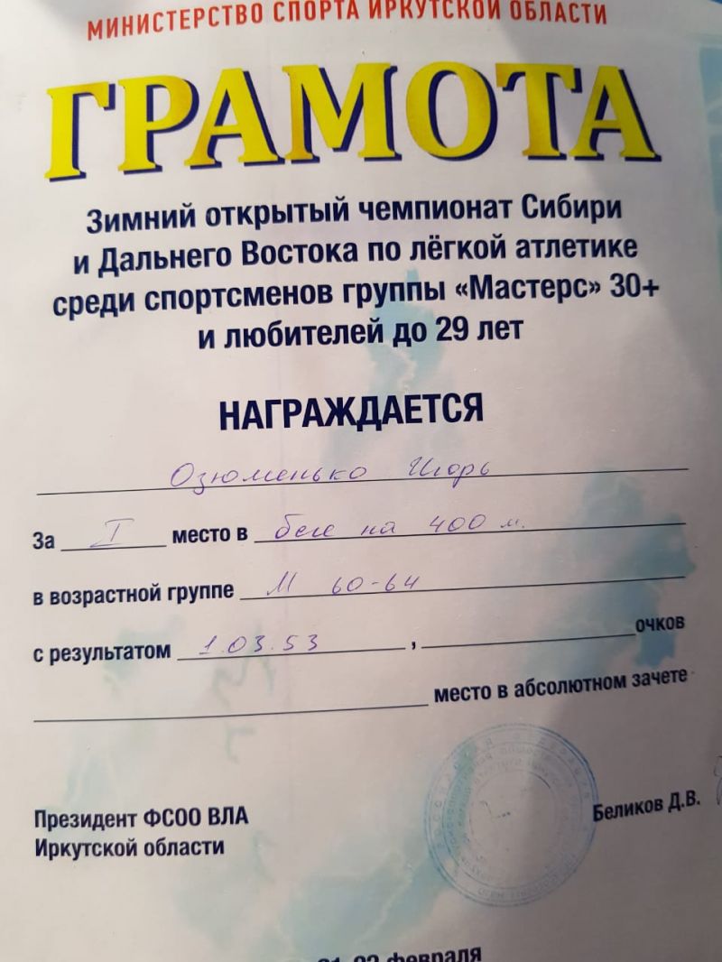 Игорь Озюменко, выступавший на этих же дистанциях, но в возрастной группе 60−64 года (25 февраля ему исполнится 61 год), не только стал победителем среди сверстников (400 метров - 1.03,53; 800 метров - 2.26,64), но стал вторым по рейтингу вообще среди всех участников на 400-метровке и первым - на дистанции 800 метров.