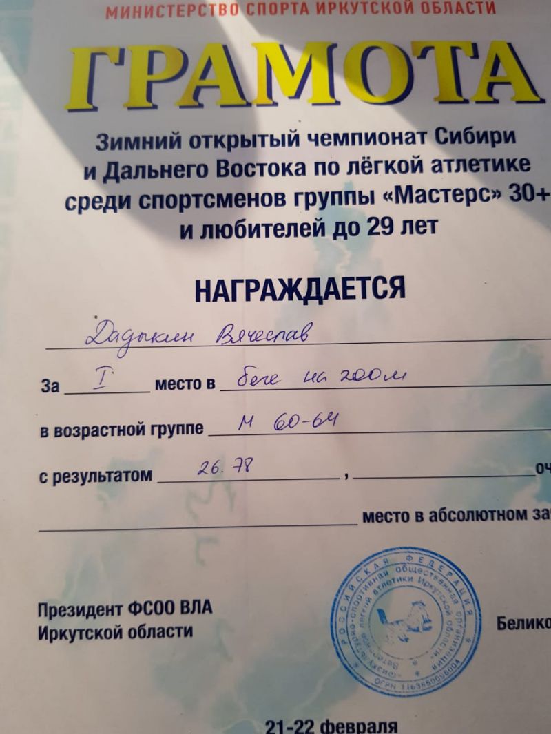 Соревнования проходили в Иркутске 21−22 февраля. Алтайский край на чемпионате Сибири и Дальнего Востока среди спортсменов-ветеранов и любителей до 29 лет представляли четыре человека из клуба бега «Восток Спорт». Все они соревновались в категории «Мастерс+30», то, есть среди ветеранов. Каждый из спортсменов выступил в своей возрастной группе на двух дистанциях, и везде наши земляки стали победителями.