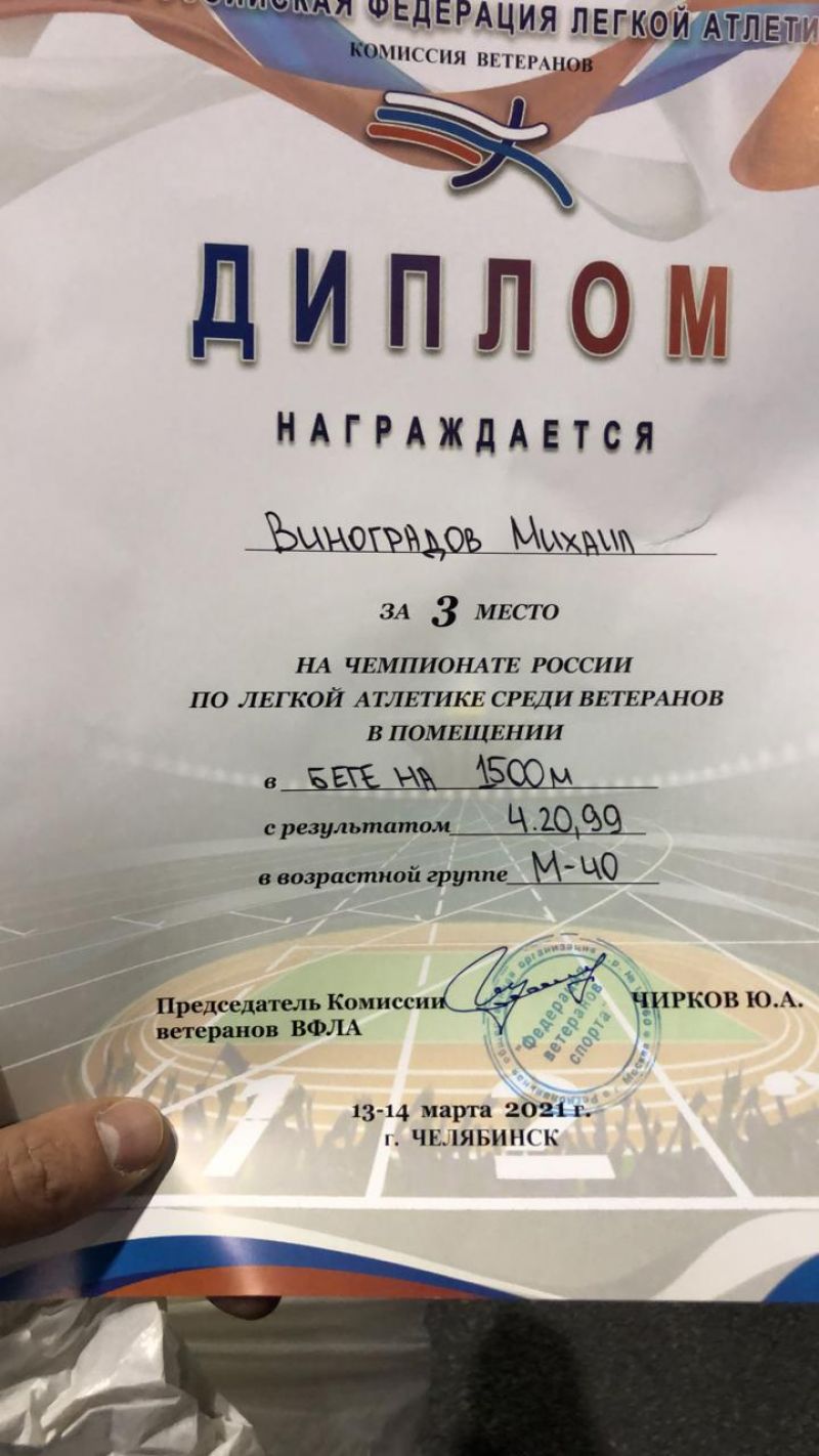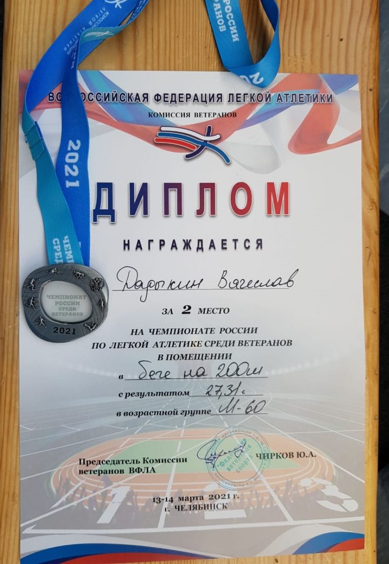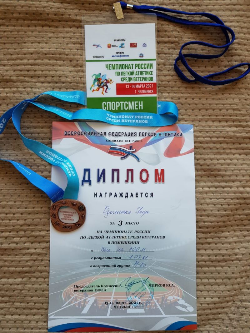 Чемпионат России по лёгкой атлетике в помещении среди спортсменов-ветеранов проходил 13−14 марта в Челябинске. Алтайский край представляли трое спортсменов барнаульского клуба любителей бега «Восток Спорт"- Игорь Озюменко, Вячеслав Дадыкин и Михаил Виноградов. Могло быть четверо, но губернатор Челябинской области продлил меры ограничений для спортсменов старше 65 лет до 21 марта и призёр летнего чемпионата России в Адлере Александр Школьников, вынужден был пропустить этот турнир.