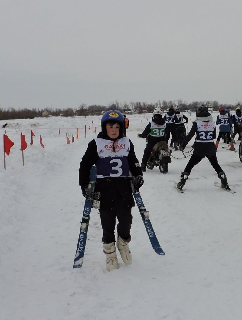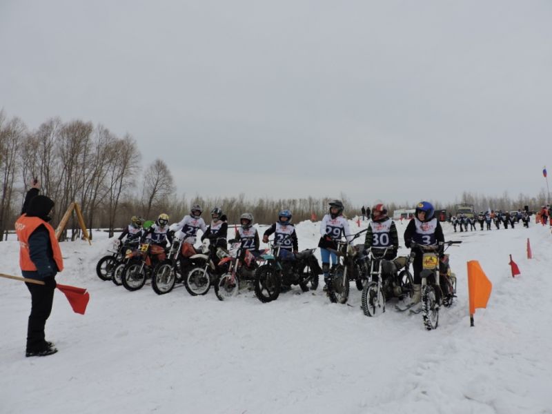 Первый заезд «мини-юниоров». Сразу тридцать мотолыжников стартуют в нём! Девять кругов успел пройти за 10 контрольных минут экипаж из Тогучина Кейлер Матвей - Глинских Андрей. Они же и стали чемпионами по итогам двух заездов с результатом 19 очков.