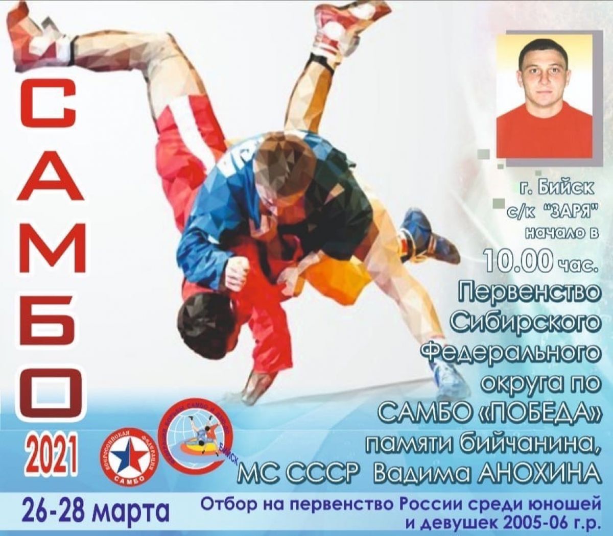 С 26 по 28 марта в с/к «Заря» города Бийска пройдёт первенство Сибирского федерального округа по самбо памяти мастера спорта СССР бийчанина Вадима Анохина.