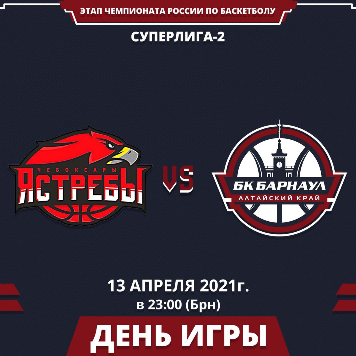 Видеотрансляция. 13 апреля. Чебоксары. Чемпионат России. Мужчины. Суперлига-2. Финал. «Чебоксарские Ястребы» - БК «Барнаул». 1-й матч