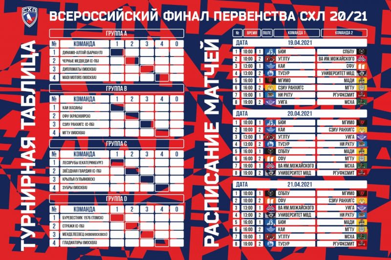 С 19 по 24 апреля в подмосковном Дмитрове пройдут матчи Всероссийского финала первенства Студенческой хоккейной лиги (СХЛ) сезона 2020/2021. Турнир проводится ежегодно с 2017 года и является пятым по счёту.