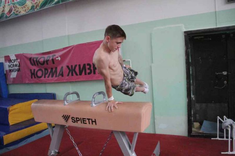 Один из самых перспективных воспитанников школы, кандидат в мастера спорта Сергей Жабин, с удовольствием отрабатывает элементы на новом коне, готовясь к финалу спартакиады молодежи.