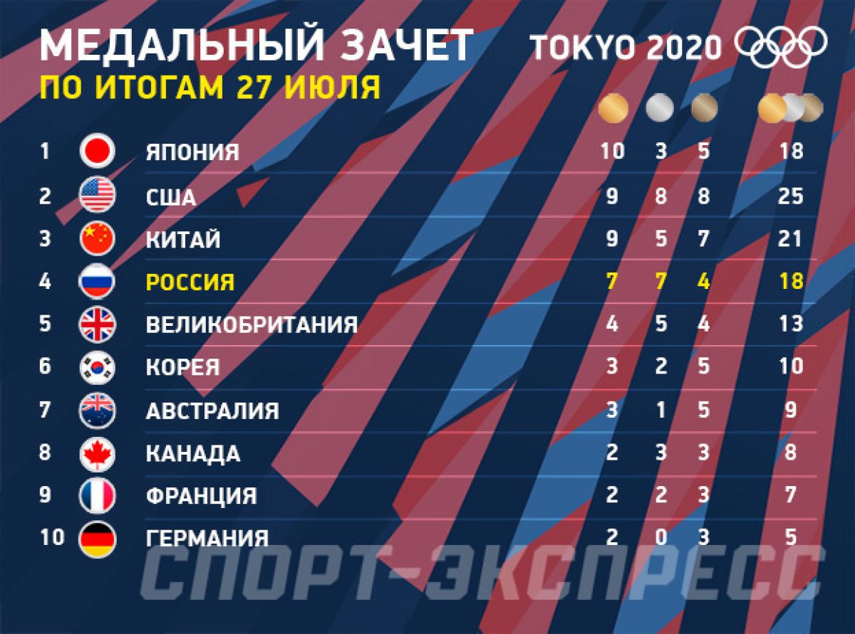На Олимпийских играх в Токио 27 июля было разыграно 22 комплекта наград. Наши завоевали шесть медалей: три золота, два серебра и бронзу. Российские атлеты смогли укрепить свои позиции в общем зачёте. Успешным стали выступления пловцов, гимнасток и стрелков из пневматического оружия.