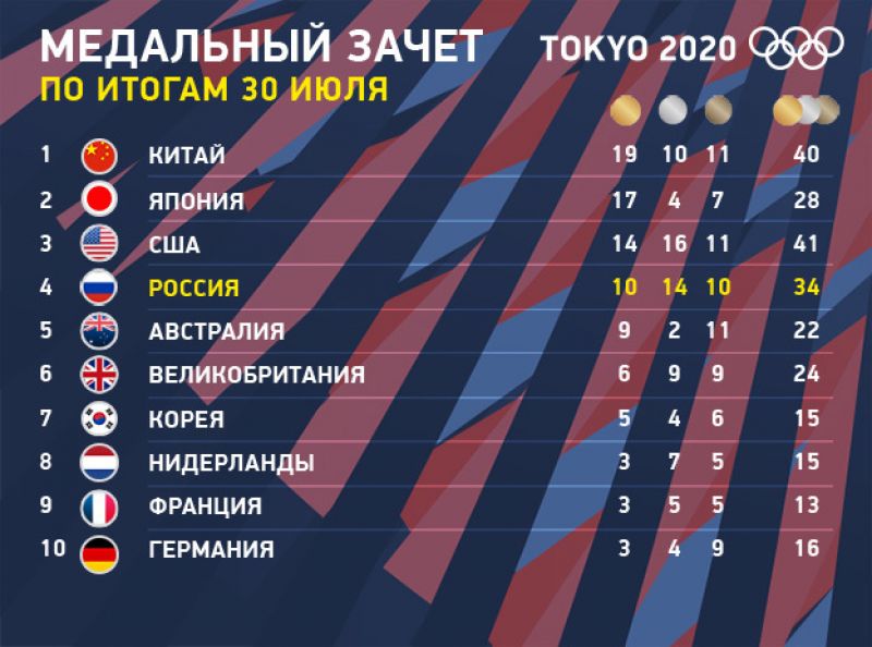 Результат российской команды 30 июля на Олимпиаде в Токио - пять медалей: два золота, три серебра и бронза.