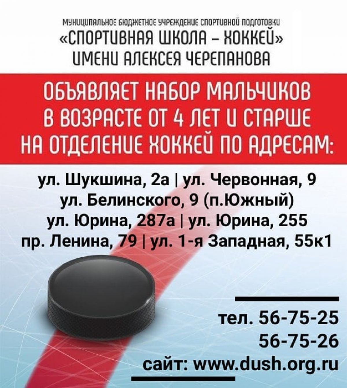 Спортивная школа по хоккею имени Алексея Черепанова объявляет набор мальчиков в возрасте от 4 лет и старше на отделение по виду спорта «хоккей».
