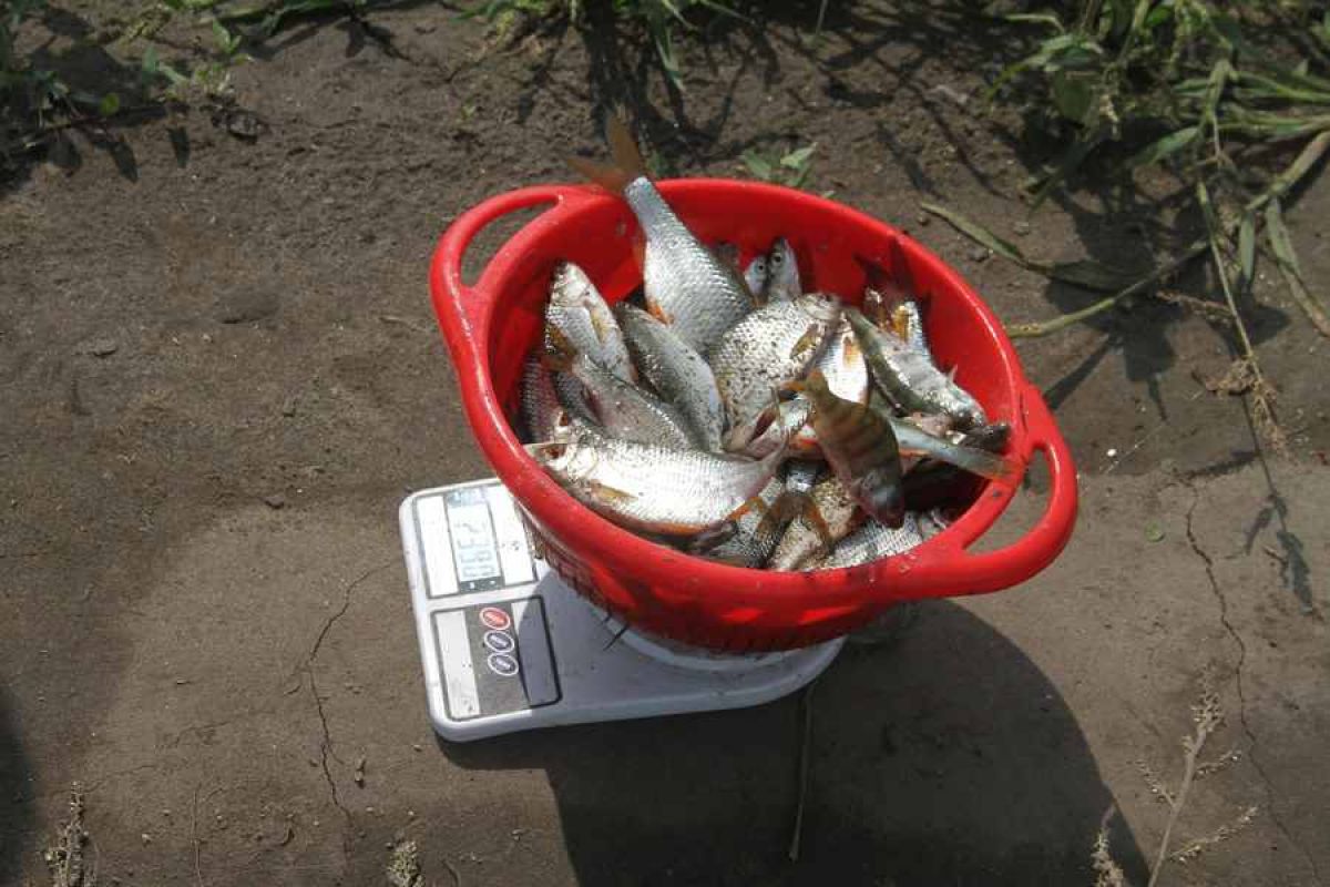 В основном участники вылавливали плотву, уклейку, лещей да окуньков средним весом граммов по 150 каждая особь. Посчастливилось ли выловить кому-то щуку, не знаю, но лично видел одного карася граммов на 500, который сразу вывел рыболова на лидирующие позиции. Кстати, не переживайте - вся пойманная рыба в момент соревнований находится в воде в садке, а после взвешивания отпускается на волю, то бишь в водоем.
