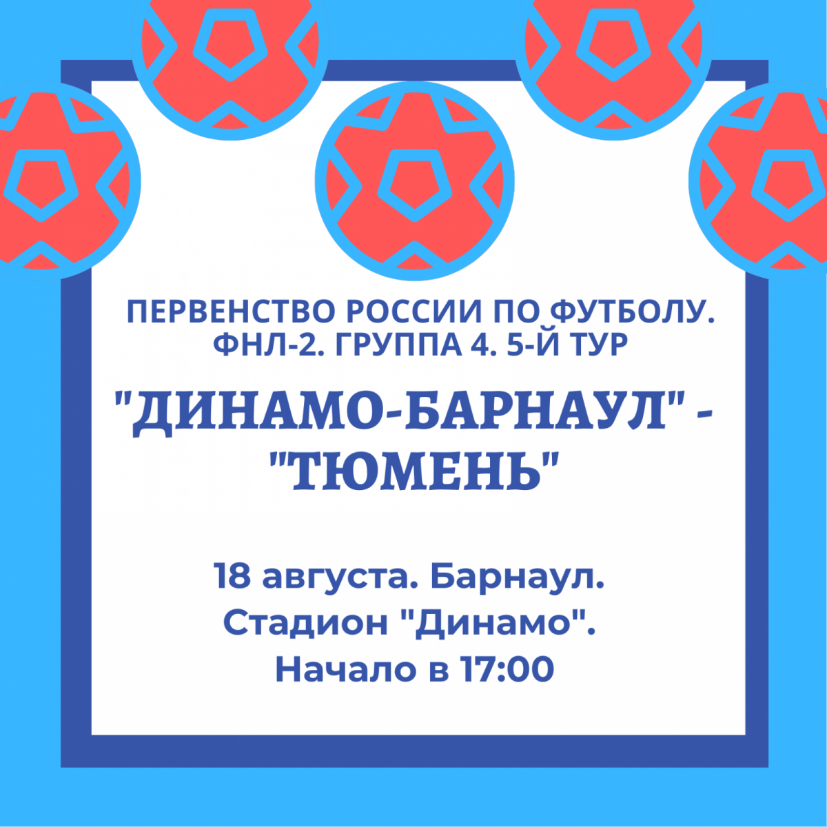 В очередном матче первенства России по футболу среди команд второго дивизиона ФНЛ в Группе 4 барнаульское «Динамо» примет на своем поле «Тюмень» из одноименного города.