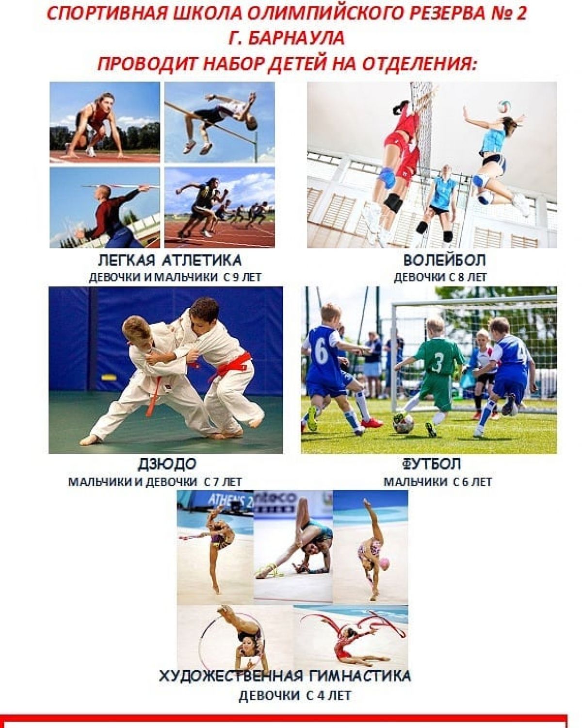 Спортивная школа олимпийского резерва № 2 в Барнауле открывает свои двери для приёма детей на следующие виды спорта:
