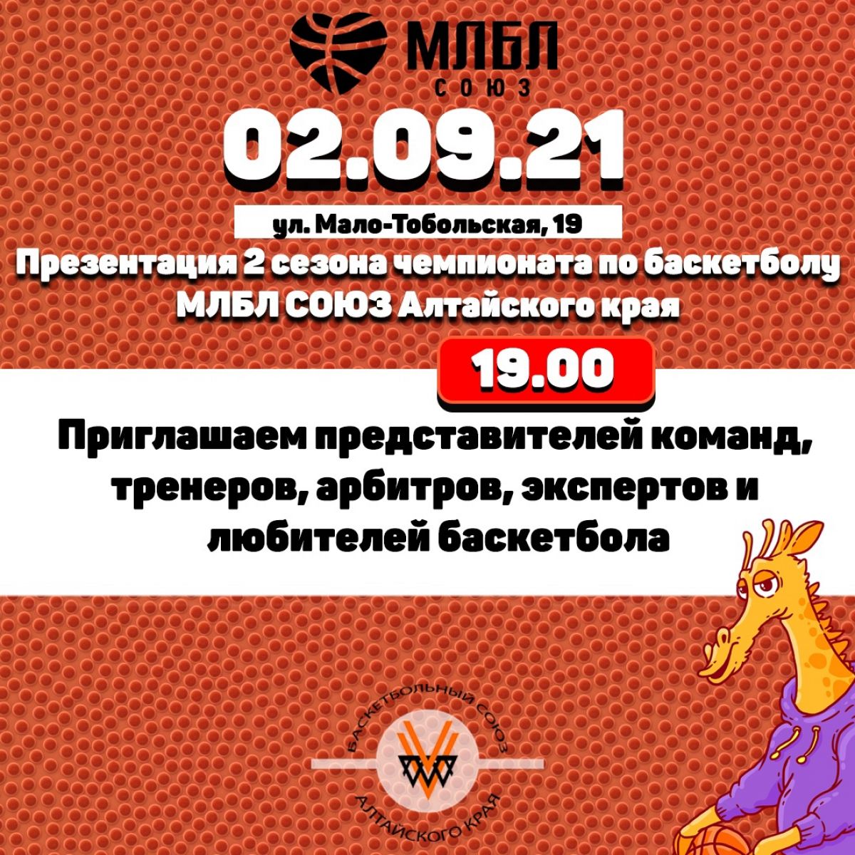 2 сентября в 19.00 в Барнауле по адресу Мало-Тобольская, 19 состоится собрание представителей команд, тренеров, арбитров и других любителей баскетбола, посвящённое началу второго сезона чемпионата по баскетболу Межрегиональной любительской баскетбольной лиги СОЮЗ.