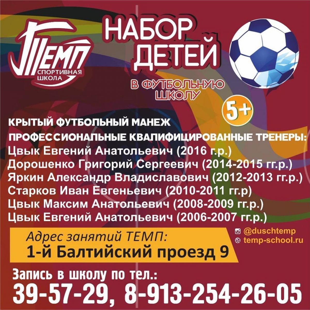 Другие тренеры спортшколы «Темп» ведут набор новых групп ребят всех возрастов: от 2006 до 2015 годов рождения.