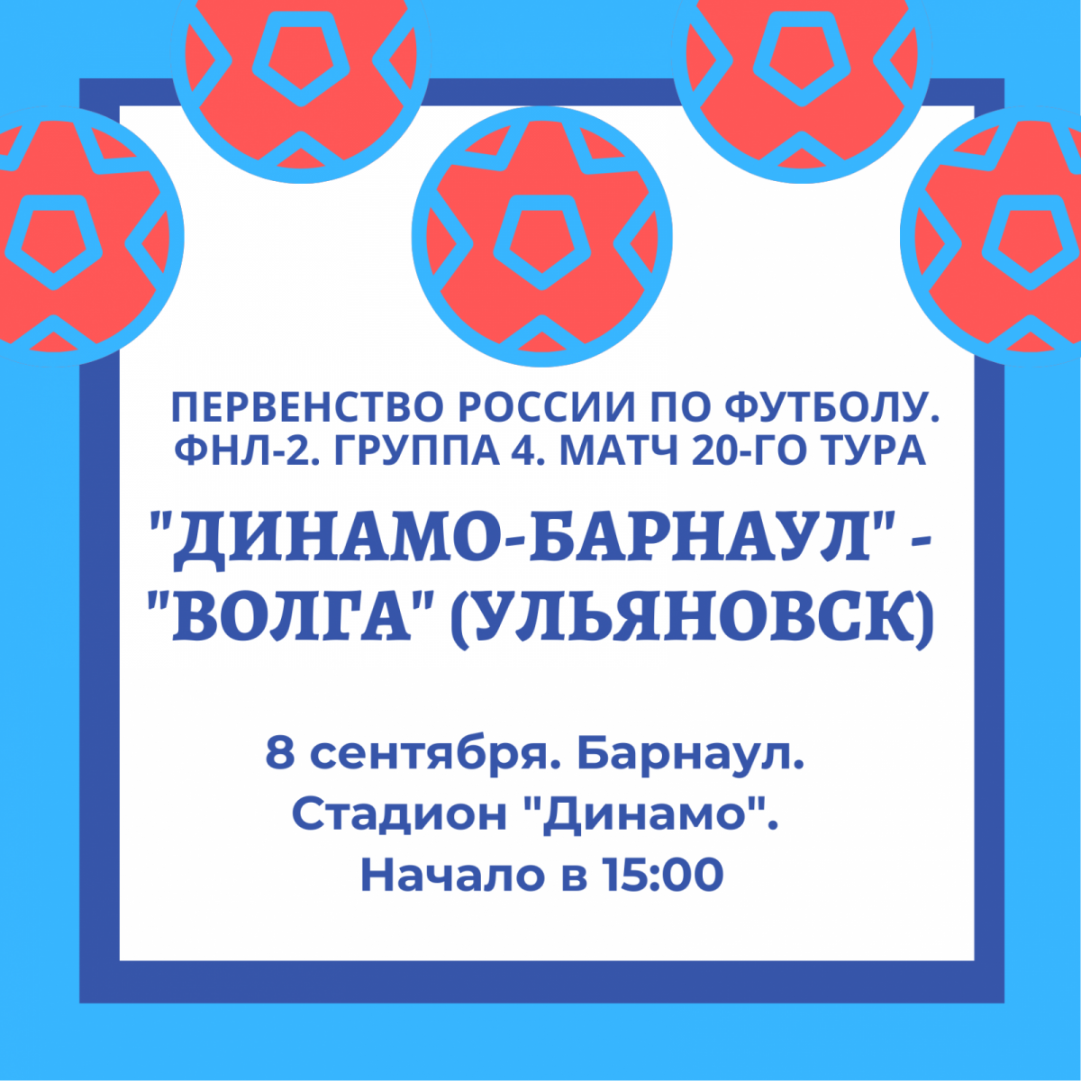 8 сентября в 15:00 на стадионе «Динамо» в Барнауле пройдёт матч 20-го тура первенства ФНЛ-2 против «Волги» из Ульяновска.