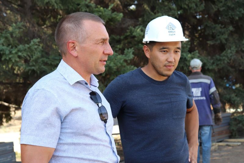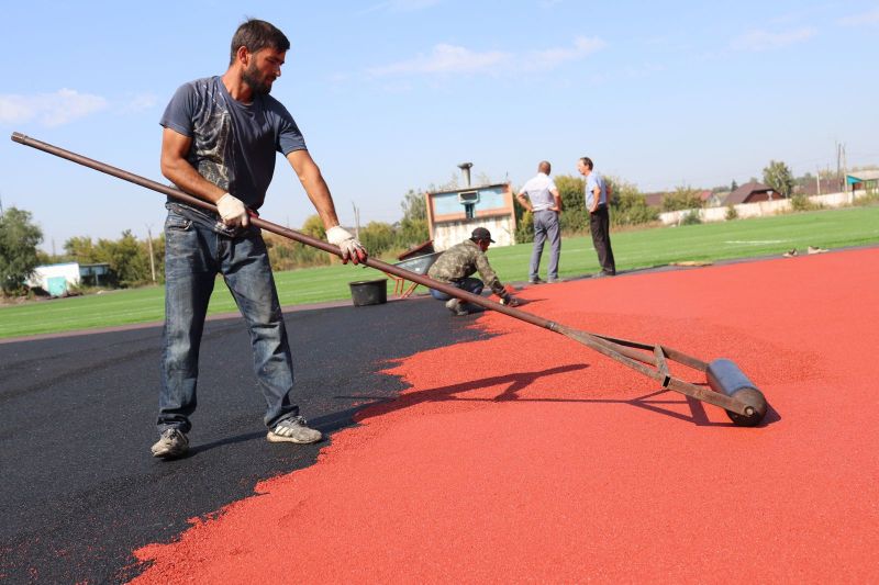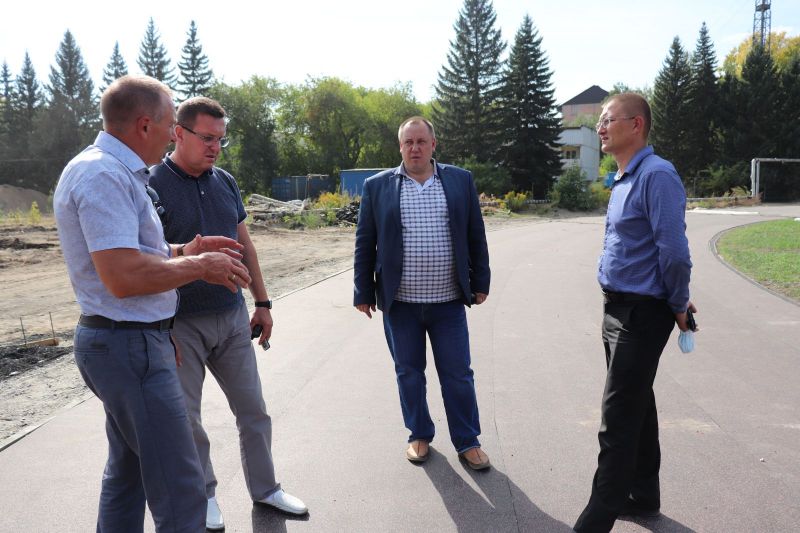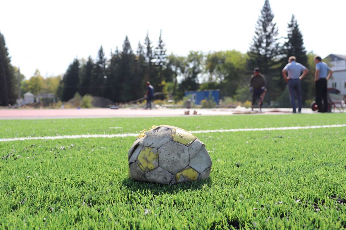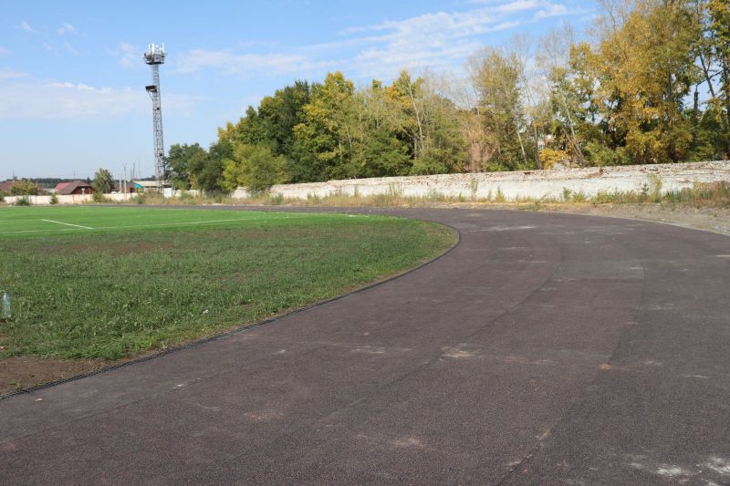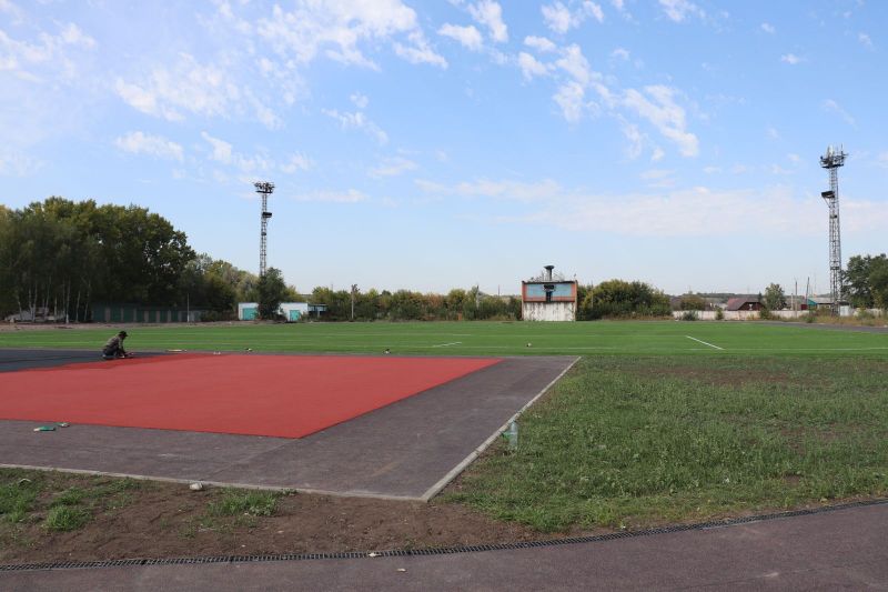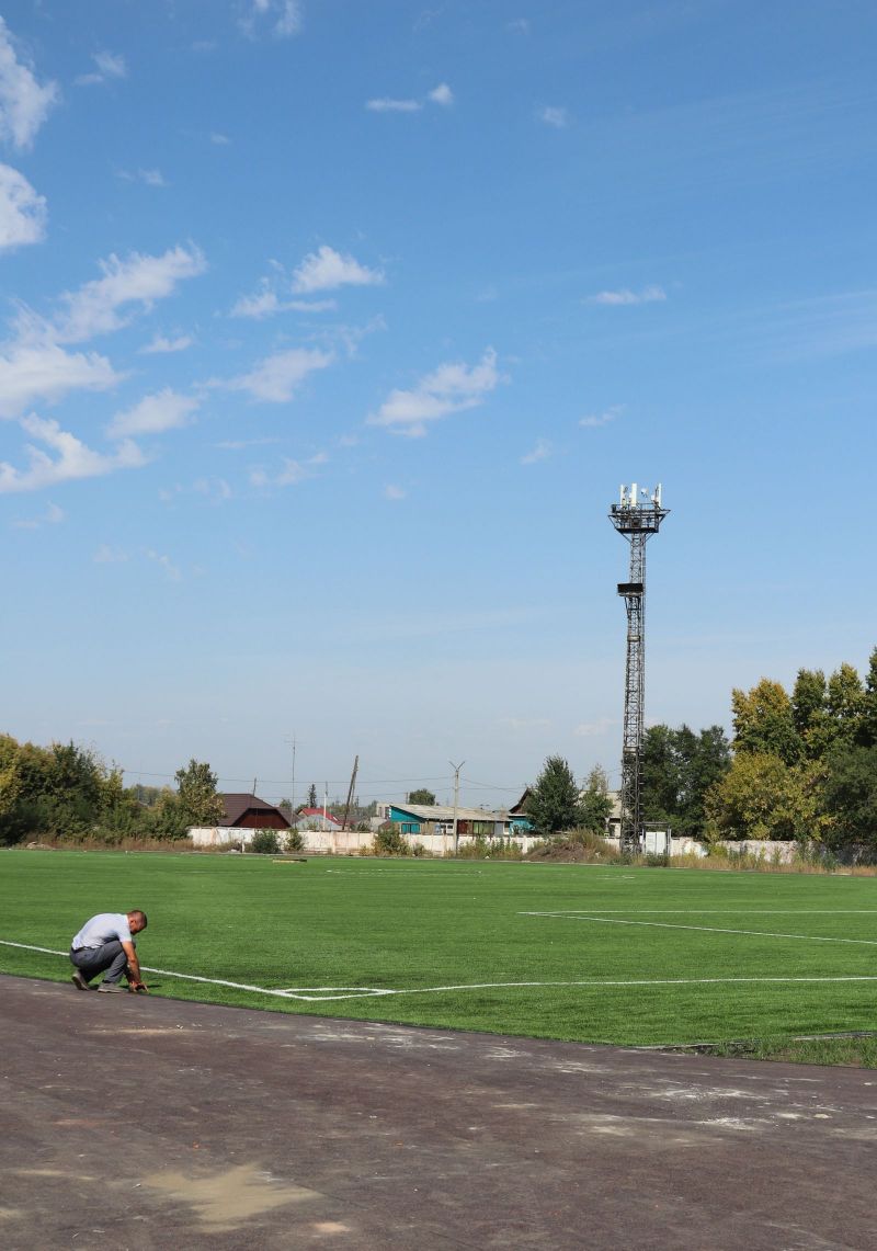 В этом году здесь постелили искусственный футбольный газон и беговые дорожки. Газону нужно ещё небольшое время, чтобы отлежаться, после чего его «причешут»: с помощью гранулята, который уже рассыпан по полю, поднимут ворс ковра и выровняют поверхность. Беговые дорожки на стадионе приклеили к основанию, остаётся проклеить швы, а потом «забронировать».