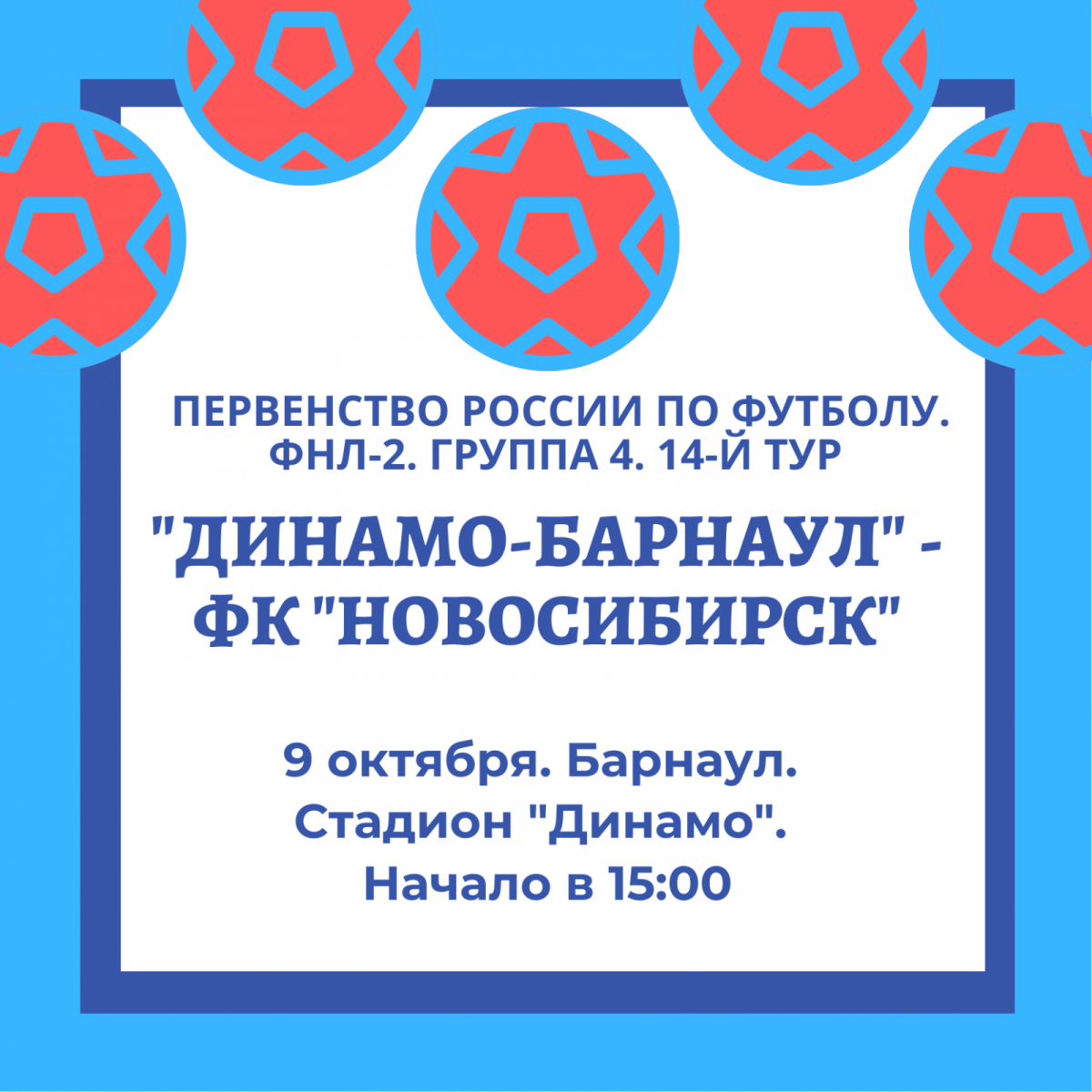 9 октября в 15:00 на стадионе «Динамо» в Барнауле пройдёт матч 14-го тура первенства ФНЛ-2. Соперником «Динамо-Барнаул» станет «Новосибирск».