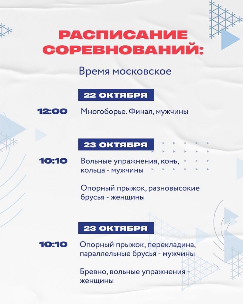 Первыми в понедельник, 18 октября, откроют турнир гимнастки, на следующий день продолжатся квалификационные соревнования у женщин и начнутся у мужчин - будем ждать выхода на помост нашего земляка, спортсмена Центра спортивной подготовки сборных команд Алтайского края Сергея Найдина.