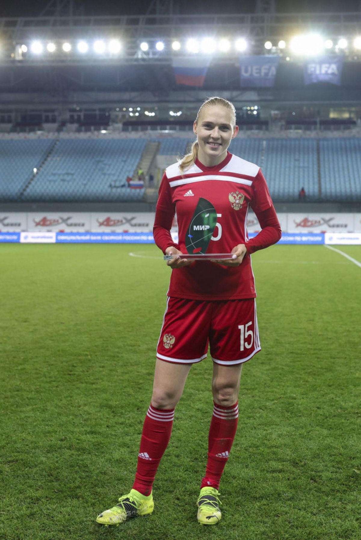 Подопечные Юрия Красножана одержали уверенную победу со счётом 3:0. Третий мяч забила воспитанница алтайского футбола Анна Беломытцева, которая получила приз лучшему игроку матча. Также у России отличились Нелли Коровкина и Кристина Машкова.
