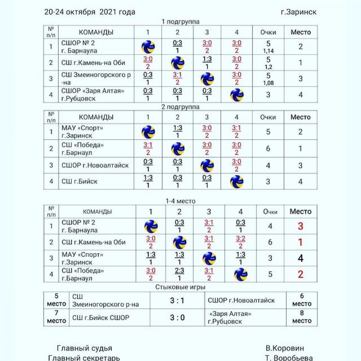 С 20 по 24 октября в Заринске на базе МАУ «Спорт» прошли финальные соревнования по волейболу XLI краевой спартакиады спортивных школ среди девушек 2006−2007 годов рождения.
