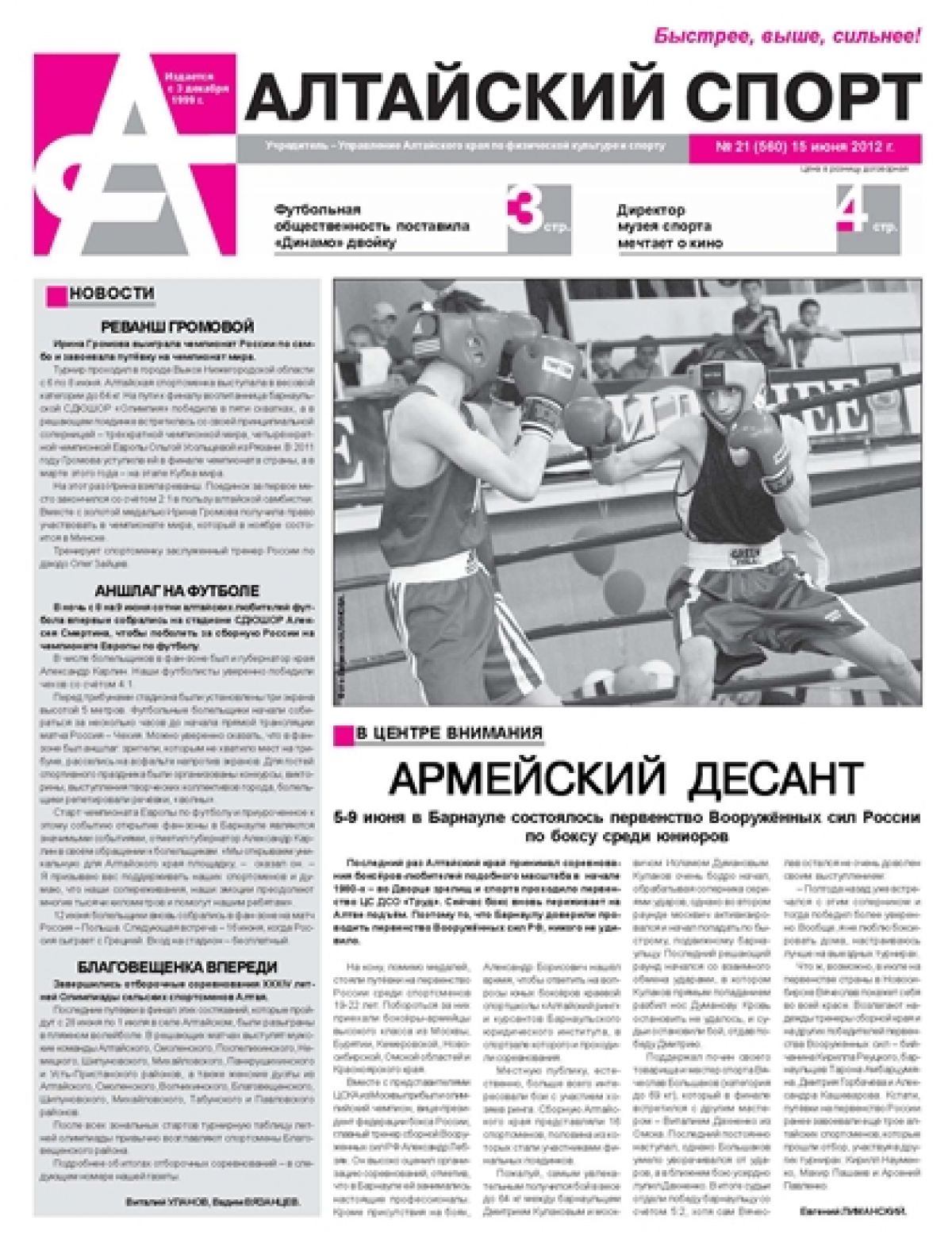 • Армейский десант. 5−9 июня в Барнауле состоялось первенство Вооружённых сил России по боксу среди юниоров.