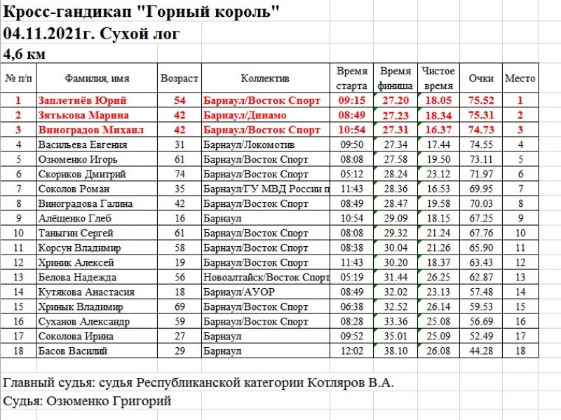 Лучшее время в забеге на 4,6 км показал Михаил Виноградов из клуба «Восток - Спорт», финишировавший с результатом 16 минут 37 секунд, вторым был Роман Соколов (16, 53), а с третьим временем прибежала Евгения Васильева (17.44). Но так как соревнования проводились с гандикапом, Михаил Виноградов появился на финише только третьим, победителем кросса «Горный король» стал 54-летний Юрий Заплетнев из клуба «Восток-Спорт», второй финишировала динамовка Марина Зятькова.