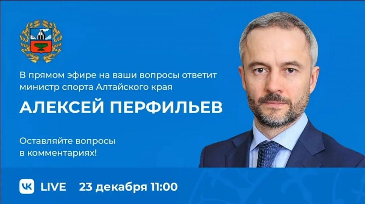 23 декабря в 11.00 в официальных группах Правительства Алтайского края, в социальных сетях ВКонтакте и Одноклассники пройдёт прямой эфир с участием министра спорта Алтайского края Алексея Анатольевича Перфильева.