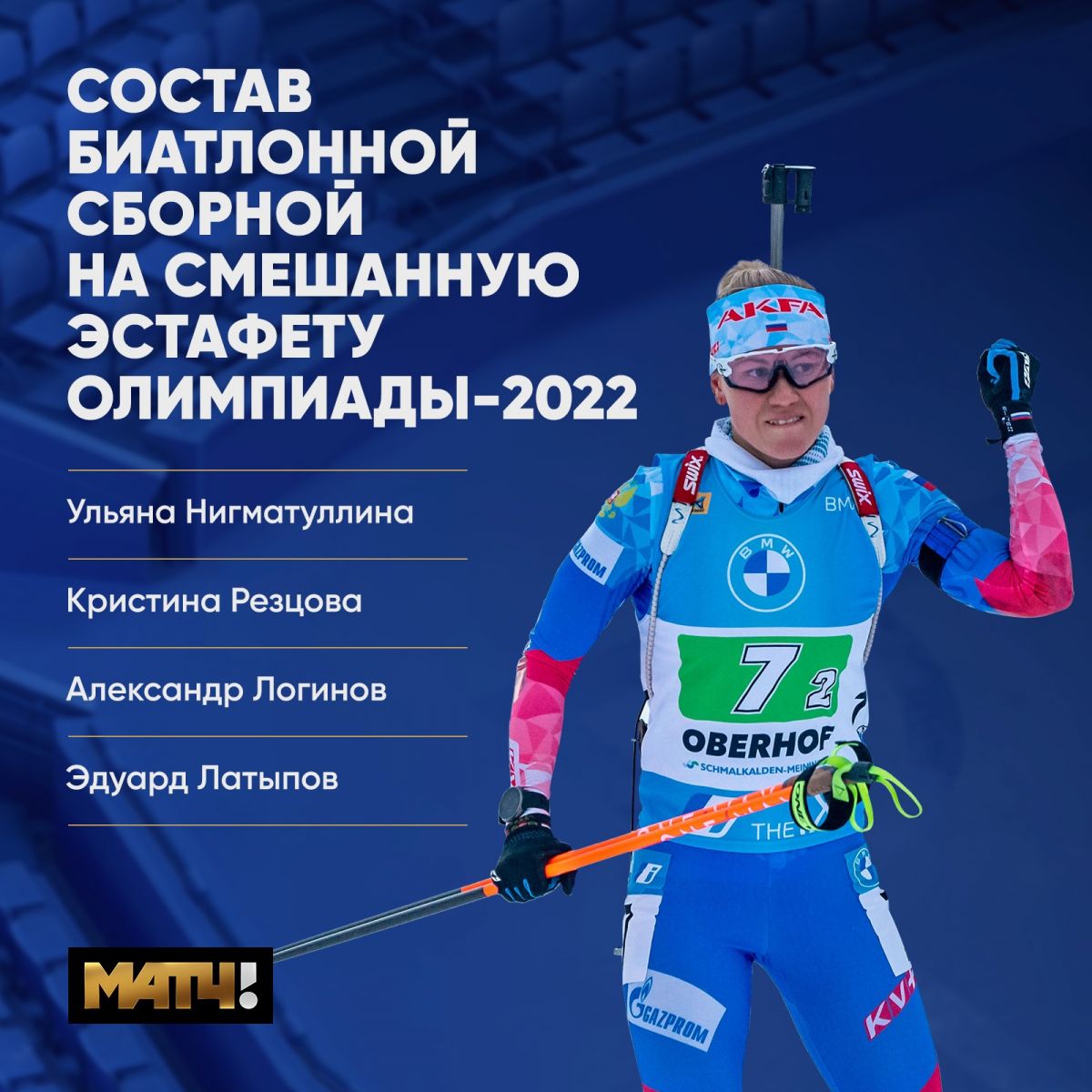 Ульяна Нигматуллина, Кристина Резцова, Александр Логинов и Эдуард Латыпов вошли в состав сборной России на смешанную эстафету на Олимпийских играх в Пекине. Об этом сообщает пресс-служба Союза биатлонистов России.