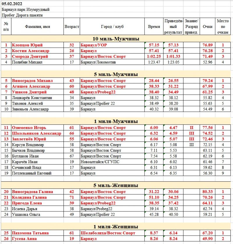 Забег на милю среди мужчин выиграл руководитель клуба «Восток Спорт» Игорь Озюменко, а на женской миле первое место заняла Татьяна Пахомова из Шелаболихи.