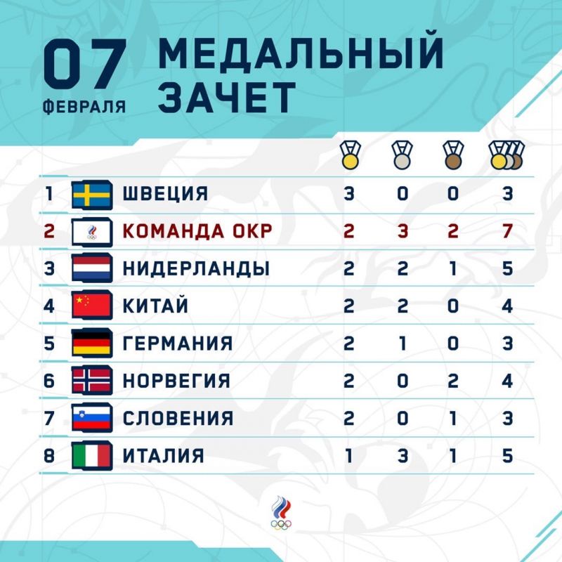 Сборная России после трёх медальных дней занимаем второе место в общем зачёте. У россиян две золотые, три серебряные и две бронзовые медали. Пока мы уступаем только шведам - у них три золотые медали.