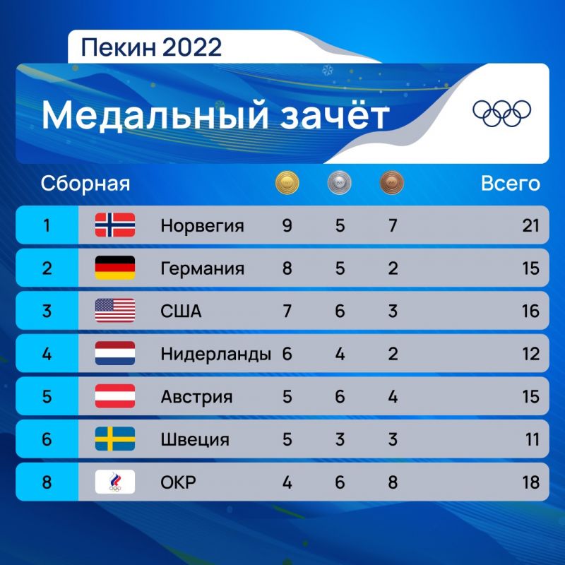 По итогам дня Россия опустилась на восьмое место в медальном зачёте с четырьмя золотыми, шестью серебряными и восемью бронзовыми наградами.