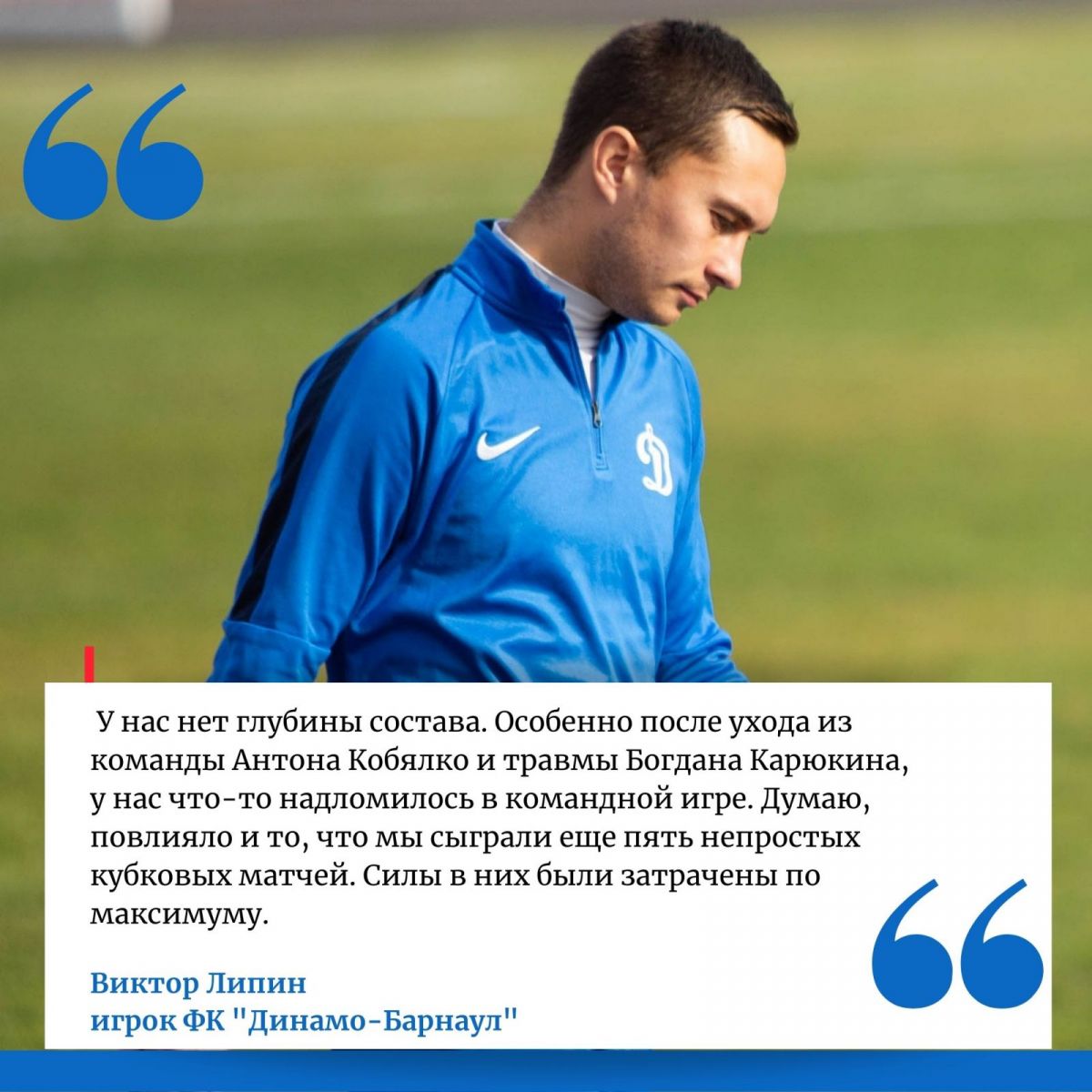 - У нас нет глубины состава. Особенно после ухода из команды Антона Кобялко и травмы основного вратаря Богдана Карюкина, у нас что-то надломилось в командной игре. Думаю, что повлияло и то, что мы сыграли еще и пять непростых кубковых матчей. А силы в них были затрачены по максимуму. Очень хотели поиграть среди команд ФНЛ и Премьер-лиги. Хотя им и проиграли, но, считаю, что задачу эту мы выполнили на отлично. У ребят было очень много травм. Ни один раз мы даже не самым сильным составом играли. К тому же, у нас в Барнауле одно из самых худших полей в зоне. В какой-то комбинационный футбол на нем играть очень сложно. Да и тренировочное поле, на котором проводится большинство наших занятий, тоже очень плохого качества, жесткое. Его, хотя бы, чаще поливали, что ли. А когда все это накапливается, вместе с психологической усталостью, то результаты и не могут быть высокими. Мы - не ЦСКА, и не «Спартак», и не «Локомотив», чтобы по два состава иметь.
