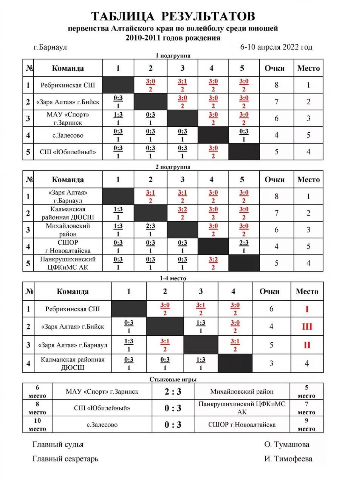 В итоге со стопроцентным результатом турнир выиграла команда юношей из Ребрихинской спортшколы, на втором месте барнаульские ребята из СШОР «Заря Алтая», на третьем - их «коллеги» из Бийска. Замкнули квартет сильнейших волейболисты Калманской ДЮСШ.