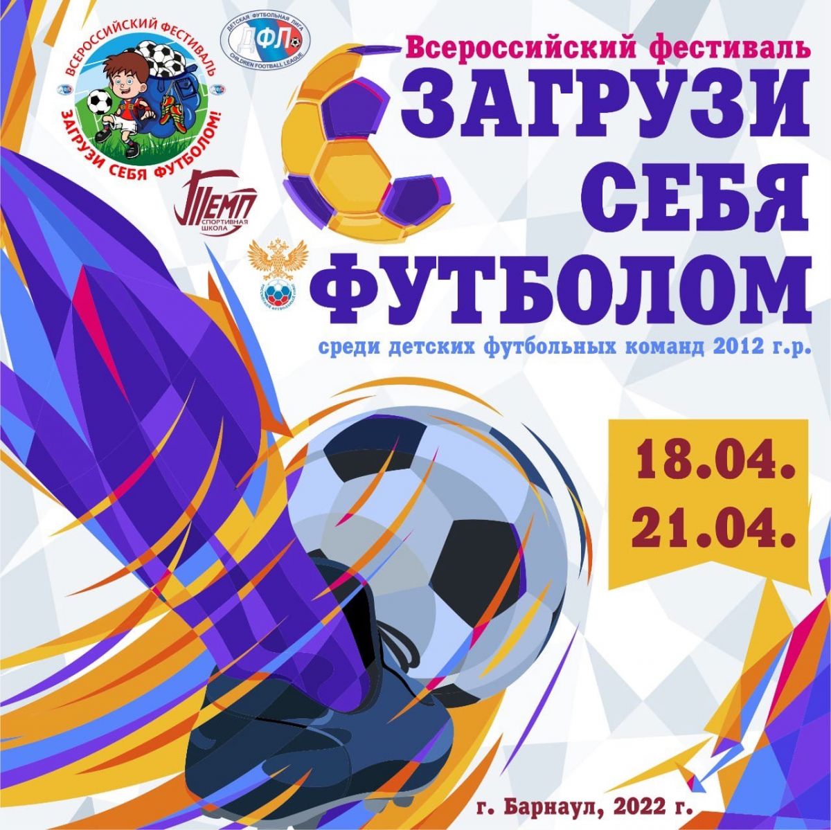 18−21 апреля. Барнаул. СК «Темп». Этап Всероссийского фестиваля ДФЛ «Загрузи себя футболом» для игроков 2012 года рождения