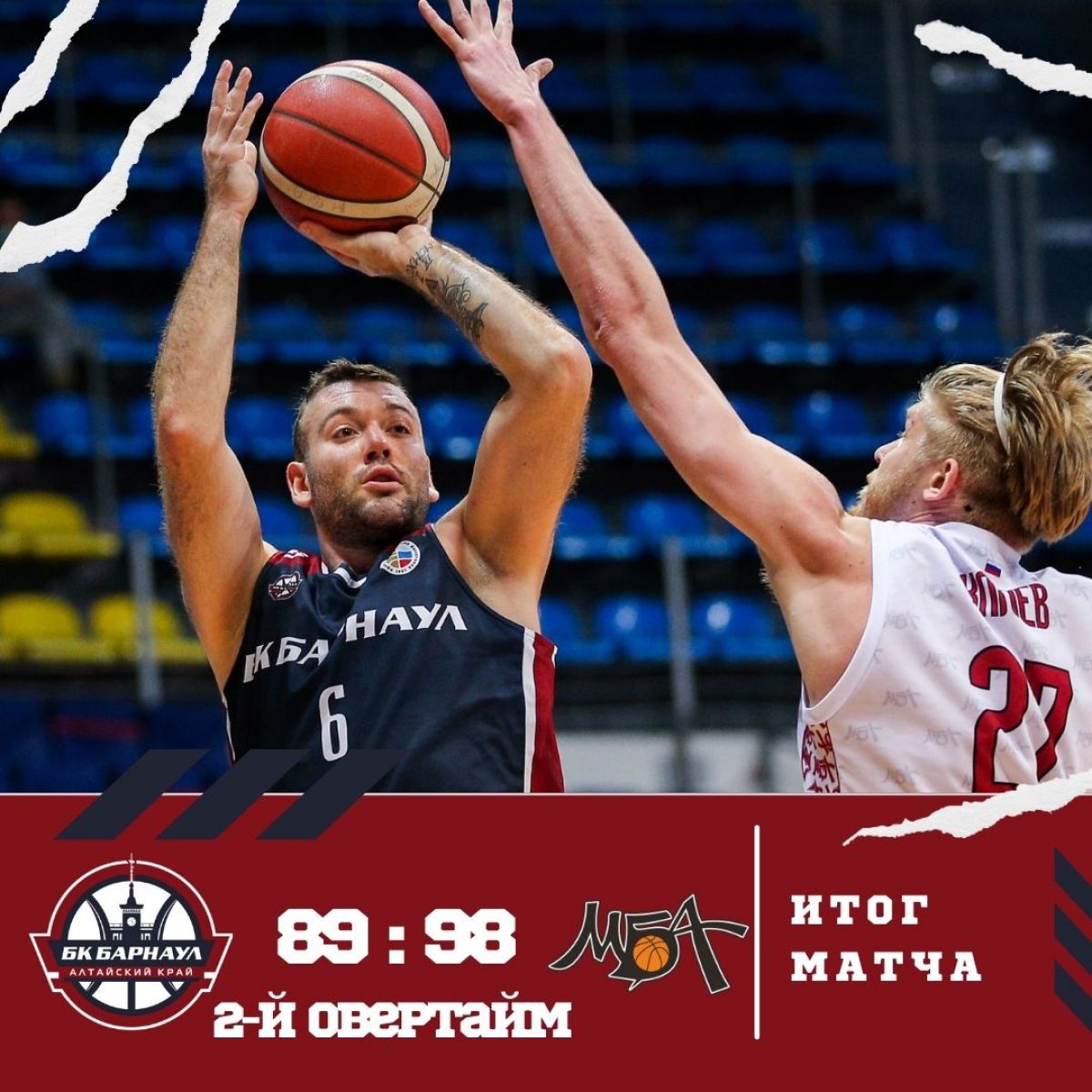 В итоге положенных по регламенту 40 минут командам для определения сильнейшего не хватило, и они еще дважды выходили на площадку. В первом овертайме «Барнаул» был очень близок к победе (85:82), но трехочковый бросок Даниила Кочергина перевел матч во второй дополнительный отрезок, и в нем уже удача и точность были на стороне МБА: 13:4 за пять минут и 98:89 в итоге.