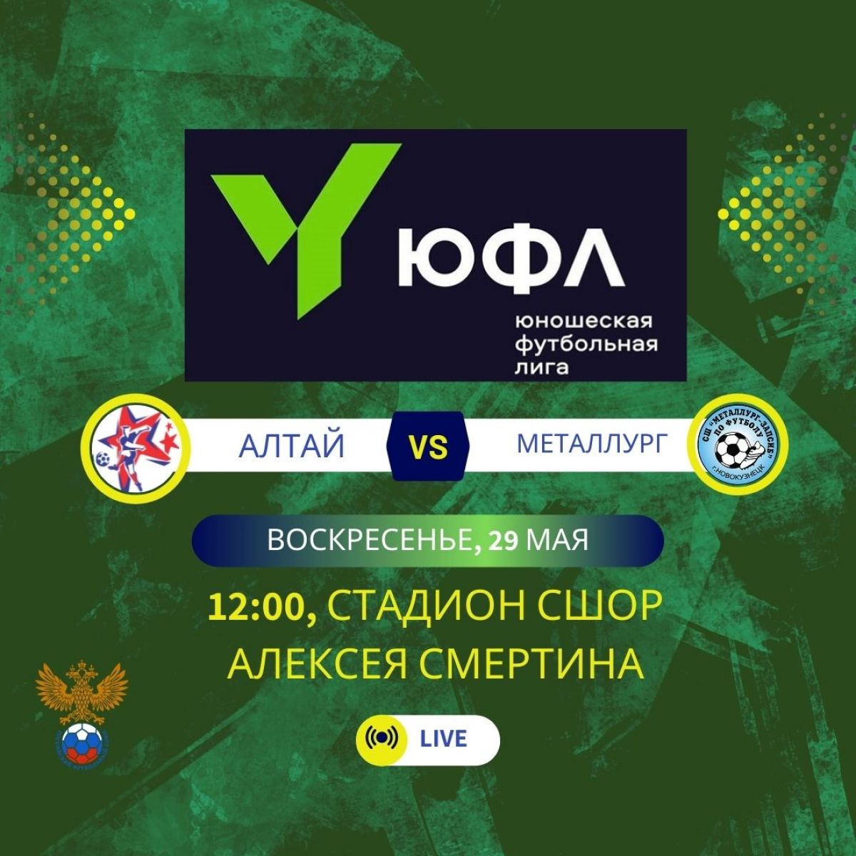 29 мая в 12:00 на стадионе СШОР Алексея Смертина состоится дебютная игра команды «Алтай-2007» под руководством тренера Николая Копылова в первом сезоне СибЮФЛ. Соперником нашей команды в первом матче будет СШ «Металлург-Запсиб» (Новокузнецк).