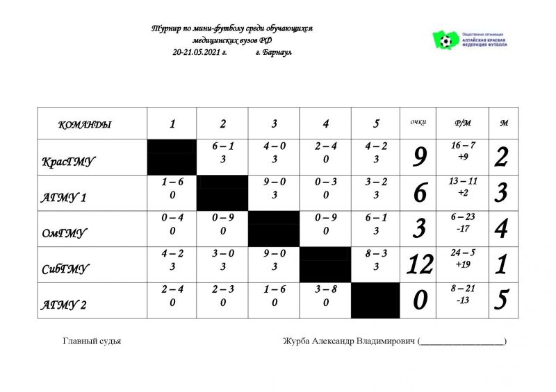 В своей первой игре они сокрушили со счетом 9:0 команду ОмГМУ. Их примеру последовали футболисты АГМУ-1, которые сначала в игре открытия в упорной борьбе преодолели сопротивление своих товарищей из АГМУ-2, выиграв с минимальным перевесом 3:2, а через игру с тем же счетом 9:0 обыграли омичей, лишив их каких-либо притязаний на призовое место. Команда КрасГМУ не без труда, но всё же одолела АГМУ-2 со счетом 4:2.