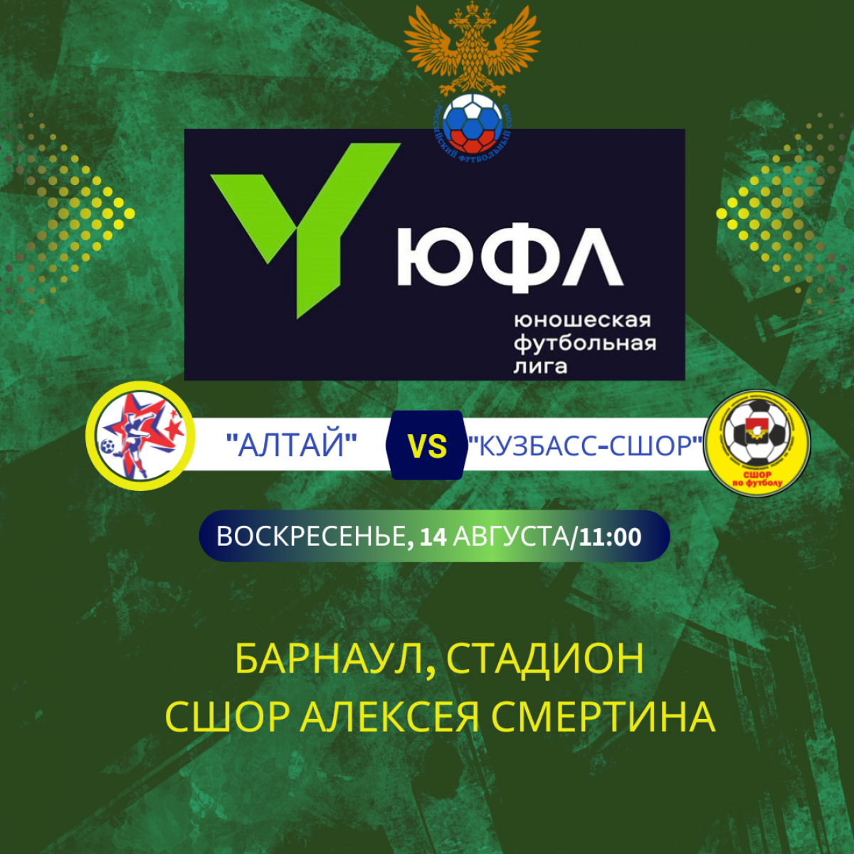 В домашнем матче 11-го тура ЮФЛ Сибирь в воскресенье, 14 августа, «Алтай» сыграет со сверстниками из кемеровского «Кузбасс-СШОР».