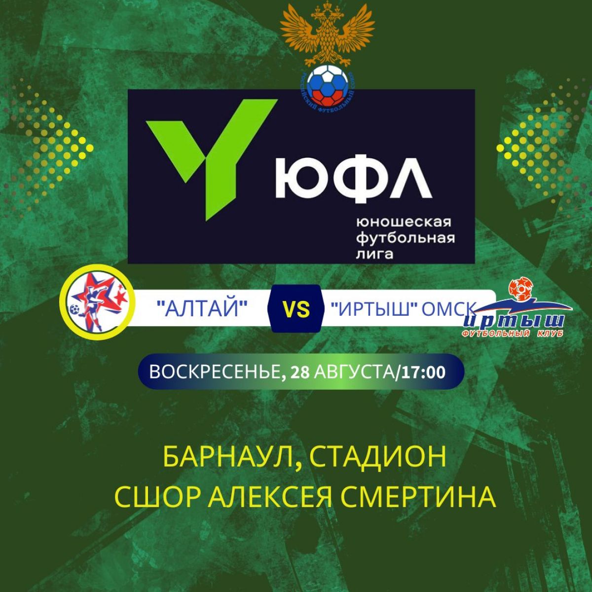 В домашнем матче 14-го тура первенства ЮФЛ Сибирь (в турнире участвуют команды, созданные из игроков 2007 года рождения), в воскресенье, 28 августа, «Алтай» сыграет со сверстниками из омского «Иртыша».