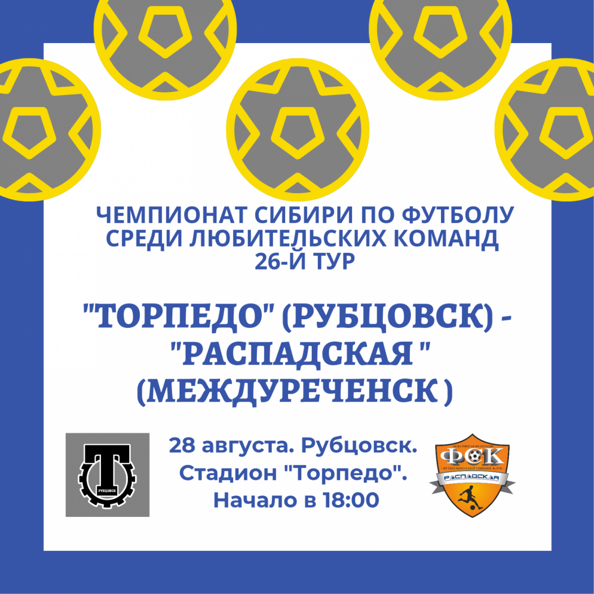 В ближайшее воскресенье, 28 августа, в День Шахтёра, рубцовское «Торпедо» принимает действующего чемпиона Сибири, представителя шахтёрского Кузбасса, команду «Распадская» из Междуреченска.