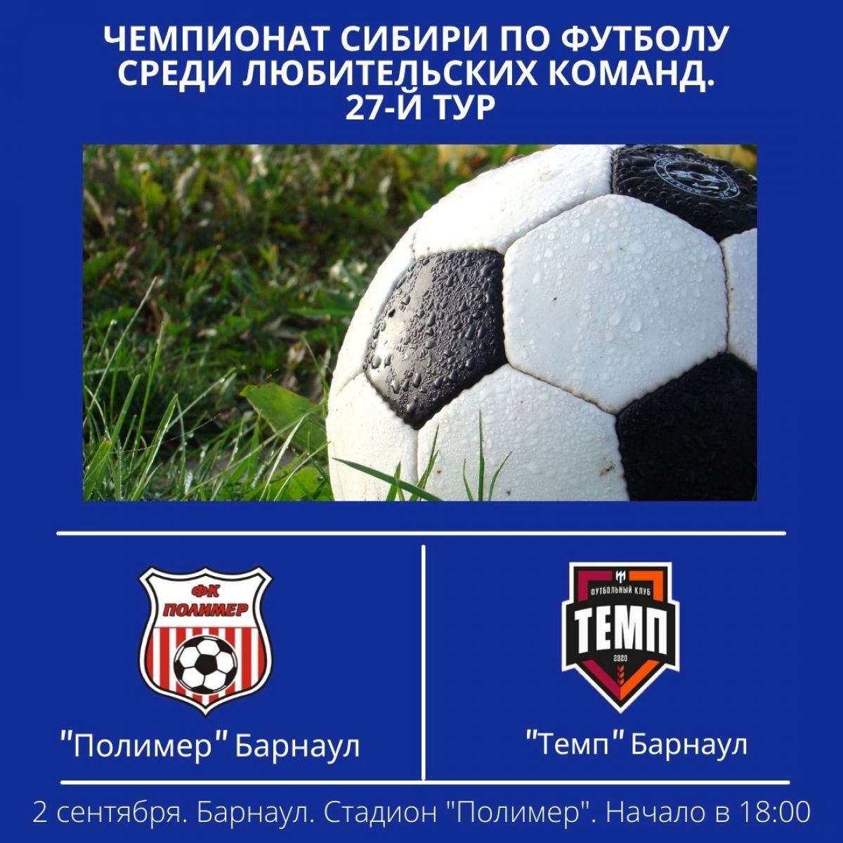 В пятницу, 2 сентября, в Барнауле на стадионе «Полимер» состоится матч очередного тура чемпионата Сибири и Дальнего Востока по футболу среди любительских команд.