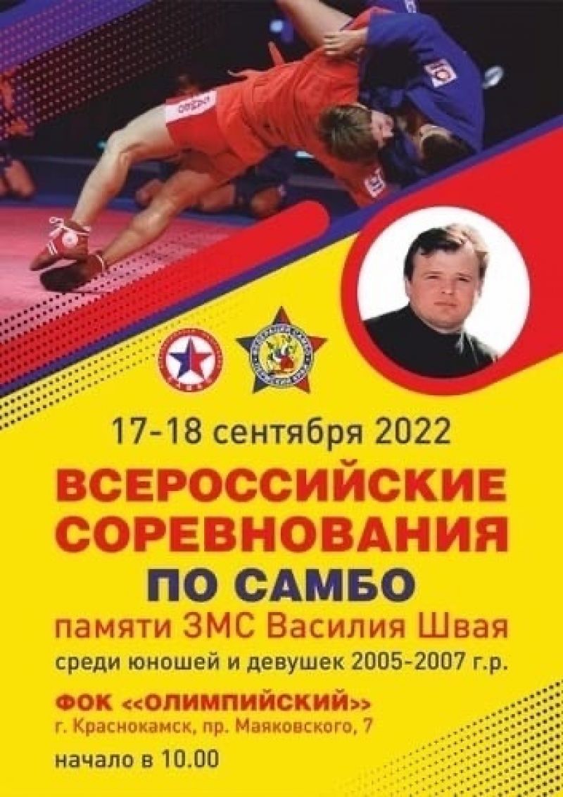 В городе Краснокамске Пермского края 17−18 сентября прошли всероссийские соревнования по самбо среди спортсменов 16−18 лет (2005−2007 годы рождения) памяти заслуженного мастера спорта Василия Швая.